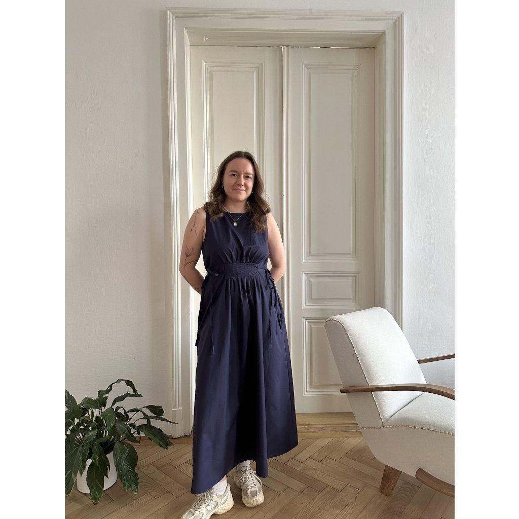 Na posledních fotkách vidíte šaty na postavě 165 cm v délce 125 cm. Odstín Hilton plus 11 (tmavě modrá)